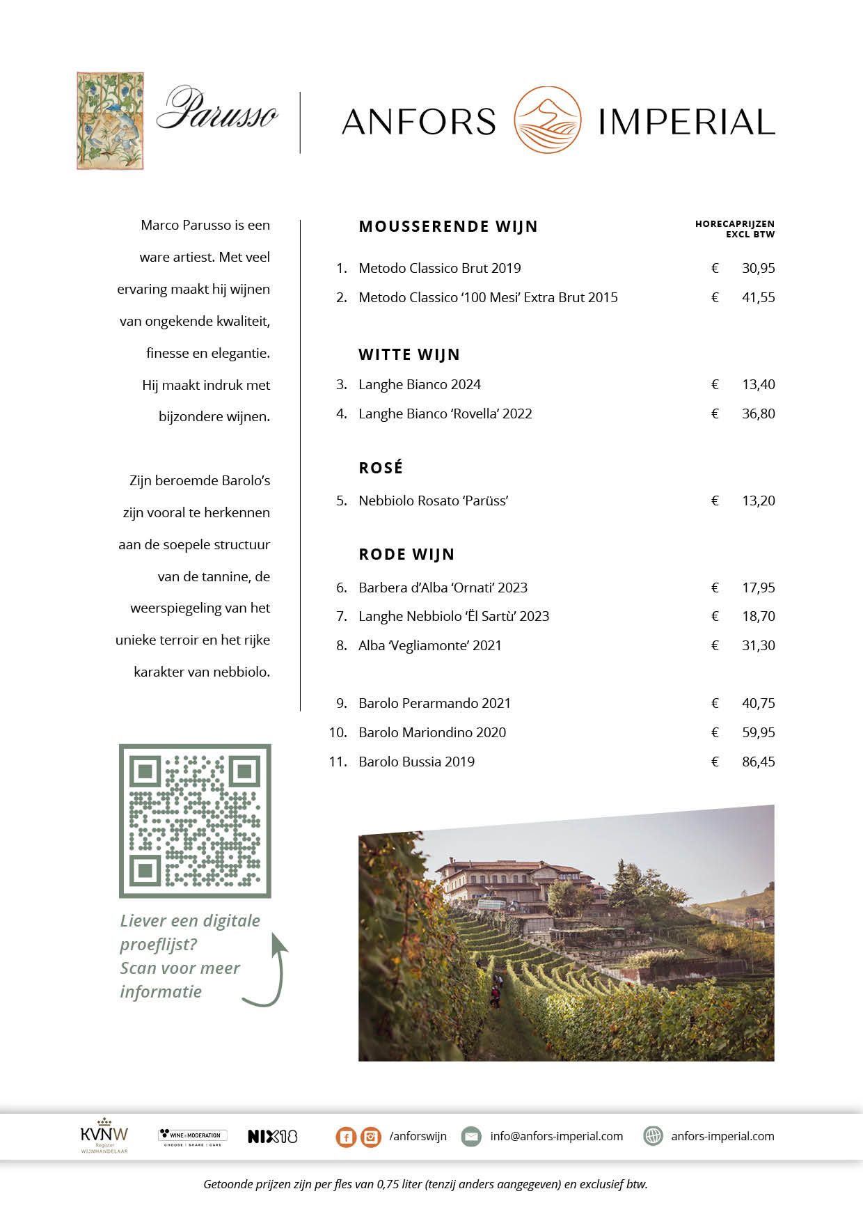 SELECTEER ONDERSTAAND UW GEWENSTE PROEFLIJST PARUSSO MARKETVISIT Zakelijke klant? Log in voor uw persoonlijke condities. ZAKELIJK INLOGGEN Wijnimporteur // >800 wijnen van >130 wijnhuizen gemaakt van >100 druivenrassen // Kwaliteitswijnen uit Italië, Spanje, Frankrijk, Oostenrijk, Duitsland en Hongarije.